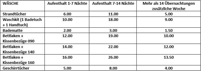 Der VERMIETER berechnet zusätzlich zur Miete eine Pauschale von 150 € pro Aufenthalt. Diese Pauschale wird einmal pro Aufenthalt von höchstens 15 Tagen in Rechnung gestellt und beinhaltet folgende Leistungen: